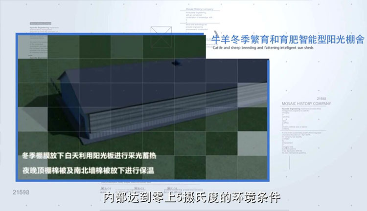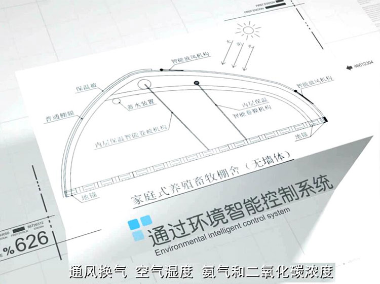 棚舍從設計、施工均為標準化模塊進行,冬季不需任何供暖,白天利用陽光板進行采光蓄熱,夜晚頂棚棉被及南北墻棉被放下進行保溫,可實現(xiàn)畜牧棚舍外界零下30攝氏度,內(nèi)部達到零上5攝氏度的環(huán)境條件。夏季南北墻棚膜卷起實現(xiàn)良好通風。冬季屋頂配置動力風機,根據(jù)舍內(nèi)有害氣體濃度進行自動換氣。
