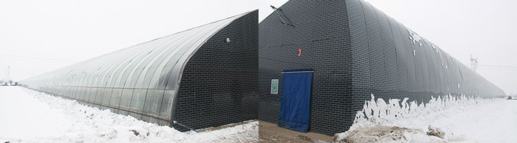 水蓄熱雙膜內保溫裝配式日光溫室的保溫被設計在溫室內,溫室內溫度達到設置溫度時會自動卷放保溫被,當遇到大雪天時由于溫室外層是外保溫膜,所以不會在保溫被上留下積雪,雪落在外保溫膜上會自動滑落到地面,這樣遇到大雪時不會因為雪量過多過重壓塌溫室。
