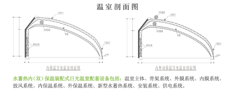 1、溫室由全鋼骨架、蓄熱水箱、雙膜單(雙)被等裝配而成,結構輕便,采光角度科學合理,實現了通風和卷簾的自動控制。具有采光和保溫性能好、蓄放熱量大、承載力強等特點。
