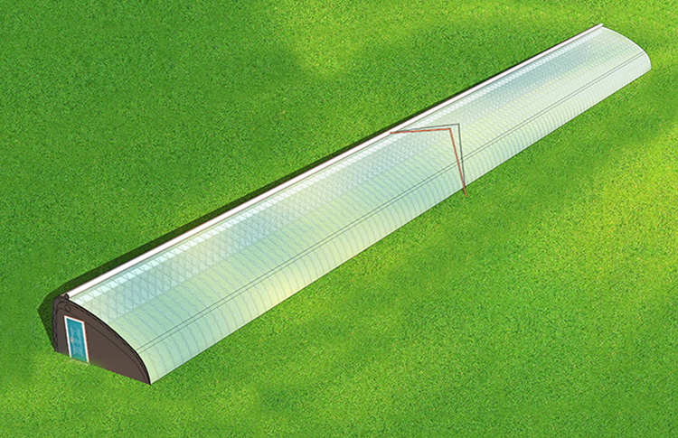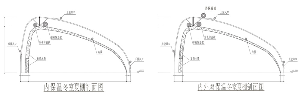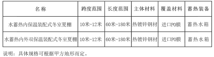 水蓄熱內(雙)保溫裝配式冬室夏棚配套設備包括:溫室主體、骨架系統、外膜系統、內膜系統、(前坡上、前坡下、后墻下)放風系統、內保溫系統、外保溫系統、后墻保溫系統、新型水蓄熱系統、安裝系統、供電系統。