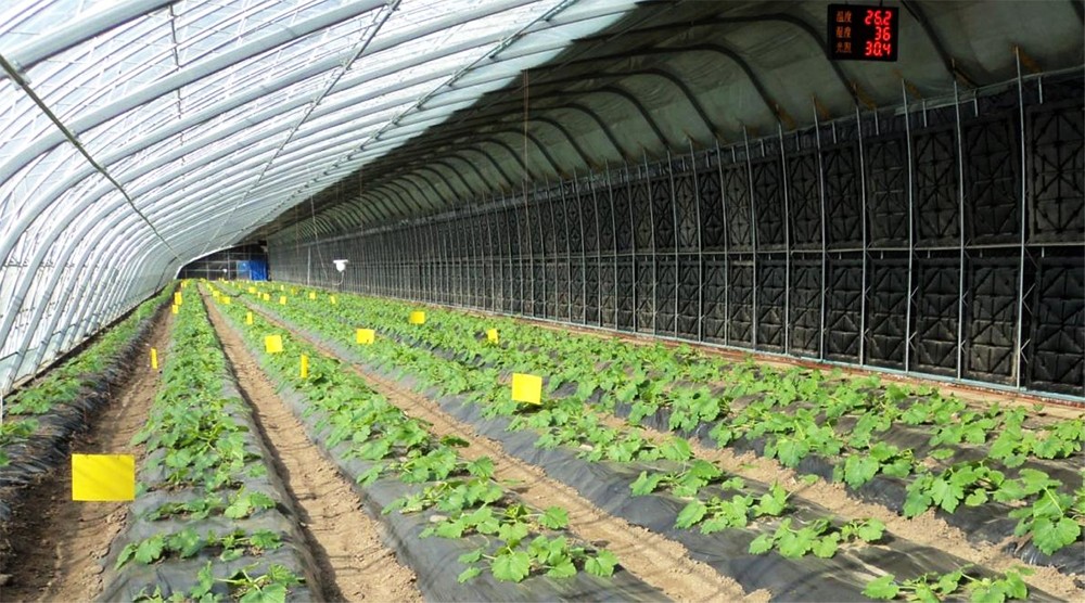 2007年以來,項目團隊不斷創新設計,優化結構參數,研發設計出新型水蓄熱內保溫裝配式日光溫室系列產品、智能經緯卷簾控制器、智能放風控制器、新型PEF保溫被、專利蓄熱水箱、CO2氣肥智能控制系統、設施農業物聯網系統等智能裝備。在冬季室外低溫天氣(-30℃)時,不需要人為加溫,水蓄熱內外雙保溫裝配式日光溫室內部溫度可達到8℃以上,比普通日光溫室高出5℃以上,保證了喜溫性園藝作物正常越冬生產。溫室圖1000.jpg